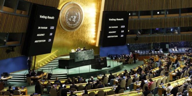 صوتت الجمعية العامة للأمم المتحدة ، في جلسة استثنائية طارئة، لصالح المطالبة بوقف فوري لإطلاق النار لأسباب إنسانية في قطاع غ-زة.