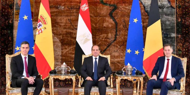 استقبل الرئيس المصري، عبدالفتاح السيسي، الجمعة، رئيسي وزراء إسبانيا وبلجيكا، وأجرى الزعماء الثلاثة مباحثات ثلاثية مشتركة لبحث تطورات الأوضاع في قطاع غ زة، وأكد السيسي أهمية الاعتراف بالدولة الفلسطينية حتى لو كانت منزوعة السلاح.