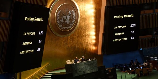 أقرت الجمعية العامة للأمم المتحدة ، بأغلبية ساحقة، مشروع قرار قدمه الأردن يدعو إلى وقف إطلاق النار بين إسرائيل و حركة “حماس”، في مواجهة اعتراض شديد من الولايات المتحدة وإسرائيل.