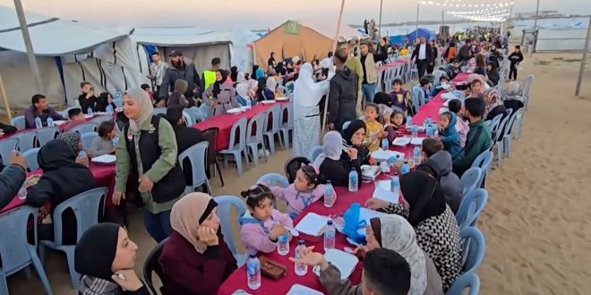 وأُقيم الإفطار الجماعي في مخيمات تأوي نازحين فلسطينيين من رفح وخان يونس بدعم من مصر.
