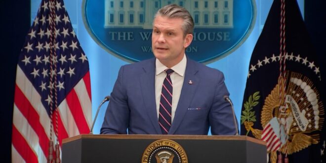خلال مؤتمر صحفي في البيت الأبيض، الاثنين، هدّد وزير الحرب الأمريكي، بيت هيغسيث، إيران، قائلًا إن وتيرة الضربات العسكرية آخذة في الازدياد، مضيفًا: "أمام إيران خيار. فلتختر بحكمة، لأن هذا الرئيس لا يتهاون".